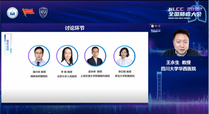 四川大学华西医院王永生教授主持了讨论环节。湖南省肿瘤医院蒲兴祥教授、北京大学人民医院李晓教授、上海交通大学附属胸科医院虞永峰教授以及青岛大学附属医院李红梅教授四位教授参与讨论环节。蒲兴祥教授认为王子兵教授的研究具有新颖性。李晓教授指出外科医生和内科医生共同学习,让外科医生有了更多的机会参与到患者的全程诊治中。虞永峰教授谈到ADC在HER2治疗中的治疗效果良好;希望未来在临床实践中,除了免疫治疗、靶向治疗,ADC药物能够大放异彩。李红梅教授认为几乎所有的治疗都是在免疫治疗时代之下进行了很多新的尝试,相信不久的将来NSCLC围术期免疫治疗能够指导临床实践。