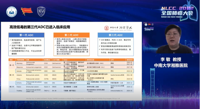 四川大学华西医院王永生教授主持,中南大学湘雅医院李敏教授为大家带来《抗体偶联药物(ADC):下一站天后》。李敏教授分享了ADC的介绍、ADC(HER2 ADC、TROP2 ADC、HER3 ADC)在晚期NSCLC的治疗探索以及ADC 在NSCLC的未来展望。目前,高效低毒的第三代ADC已进入临床应用;相比目前SoC和其他抗HER2治疗,T-DXd疗效卓越且优化剂量安全性更优。对ADC的耐药机制已进行假设并得到体外证据的支持,但尚未在癌症患者中证实,未来,ADC进展耐药机制仍需进一步探索。