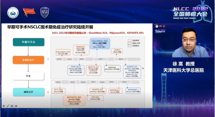 第二环节由南昌大学第一附属医院熊建萍教授主持。天津医科大学总医院徐嵩教授就《免疫时代的外科临床思考》展开精彩报告。徐嵩教授分享围术期靶向治疗仅在EGFR阳性患者中有DFS获益,但是对于OS的改善并不明显,围术期治疗模式仍需探索。目前,早期NSCLC围术期免疫治疗模式多样,新辅助免疫治疗较辅助免疫治疗更有优势,但是机制尚未清楚,有待研究。