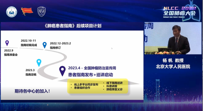 第一环节由河南省肿瘤医院王慧娟教授主持。北京大学人民医院杨帆教授报告了《肺癌患者指南》项目进展。我国医疗工作全面贯彻落实“以患者为中心”和“MDT到HIM”的诊疗理念,在以患者为中心的医疗工作中,指南是重要的健康教育工具。《肺癌患者指南》项目是在循证医学理念指导下,以患者关注的健康问题为中心,以当前可获得的最佳证据为基础;希望成为一部以实用性为主,以问题为导向,充分考虑肺癌患者需求、覆盖肺癌患者诊疗全程的适合患者使用的指南。指南准备会于2022年9月完成,将于2023年4月启动全国肿瘤防治宣传周,期待各中心的加入!