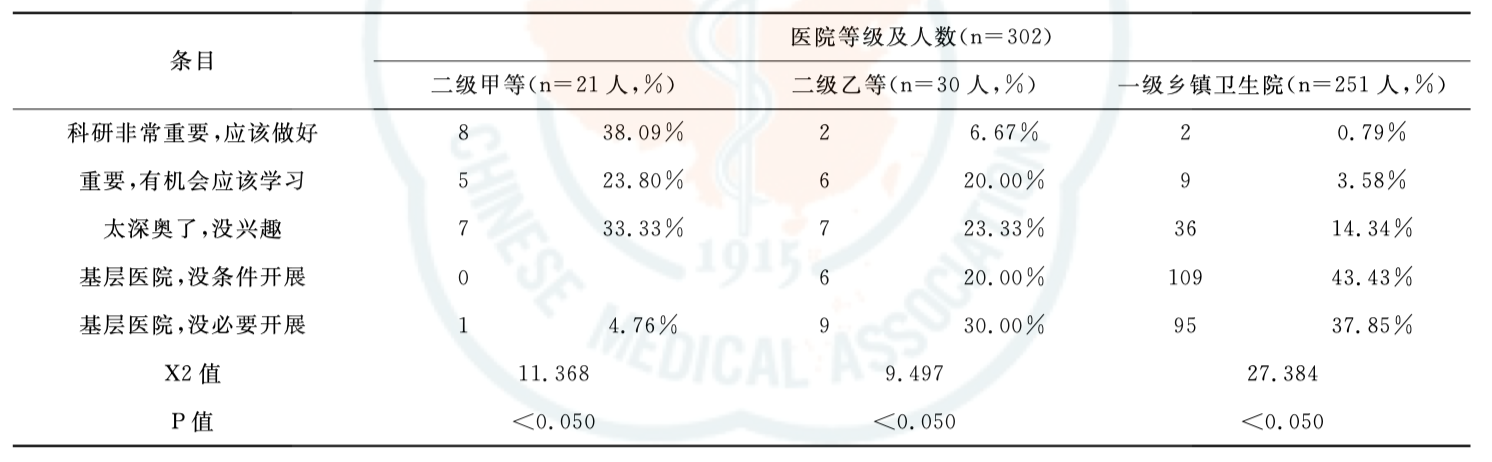 表1 不同级别基层医院医务人员对科研的认识及兴趣