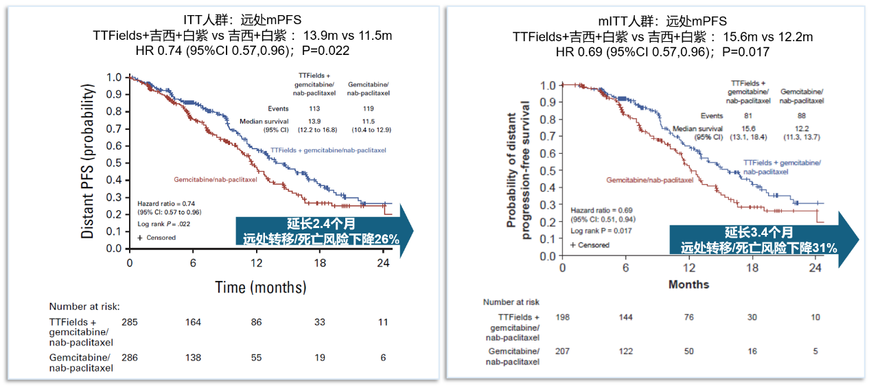 dPFS在 TTFields 联合化疗组中显著延长[中位13.9 个月(95% CI:12.2~16.8个月)vs 11.5 个月(95% CI:10.4~12.9个月);HR=0.74(95% CI:0.57~0.96),P=0.022],mITT 人群中结果相似。