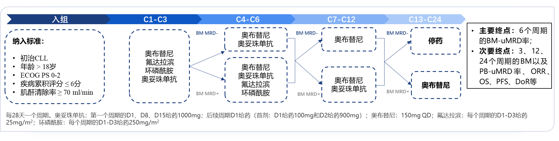 本研究是一项前瞻性、多中心、开放标签、Ⅱ期研究(NCT05322733),旨在探索奥布替尼联合氟达拉滨、环磷酰胺和奥妥珠单抗(OFCG)联合方案用于初治CLL/SLL患者的有效性和安全性。具体研究设计如下(图3):