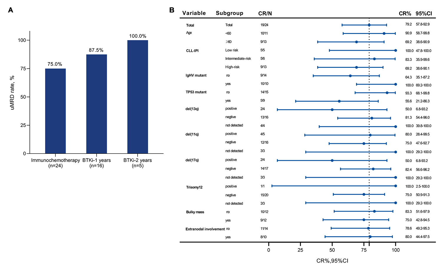 图2 患者uMRD率以及CR亚组分析