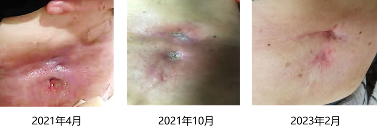患者入组瑞派替尼二线治疗中国桥接研究,2021年4月开始口服瑞派替尼150mg/d,治疗期间患者耐受良好,腹壁窦道无感染,出血等,窦口逐渐愈合。