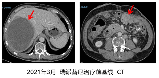 瑞派替尼治疗期间的最佳疗效为疾病稳定(SD),2023年5月治疗25个月后,CT结果显示:肝右后叶见巨大囊实性肿块,肿块大小约12.1cm×10.3cm×12.6cm,右侧腹壁横结肠造瘘,造瘘口区肠壁未见明显增厚,左侧腹壁软组织增厚,肿胀,与邻近降结肠,空肠粘连,吻合口分界不清。疾病仍稳定。直到2023年11月CT结果显示:肝右叶肿块大小约13.7cm×12.3cm×13.8cm,切口旁大网膜类圆形肿块影,大小约2.3cm×3.0cm。邻近空肠受压,局部分界不清,明显强化。疾病进展出组,瑞派替尼治疗时间为31个月
