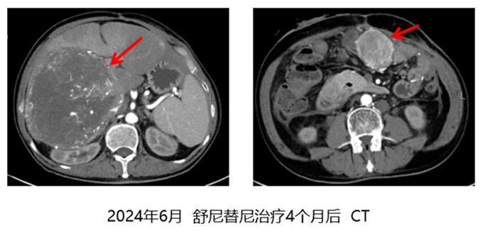 2024年6月再次复查CT示:上腹前缘病灶大小5.6cm×5.4cm,肝右叶肿块约15.4 cm×13.9cm。病灶进一步增大。患者自行停用舒尼替尼后服用中药治疗。