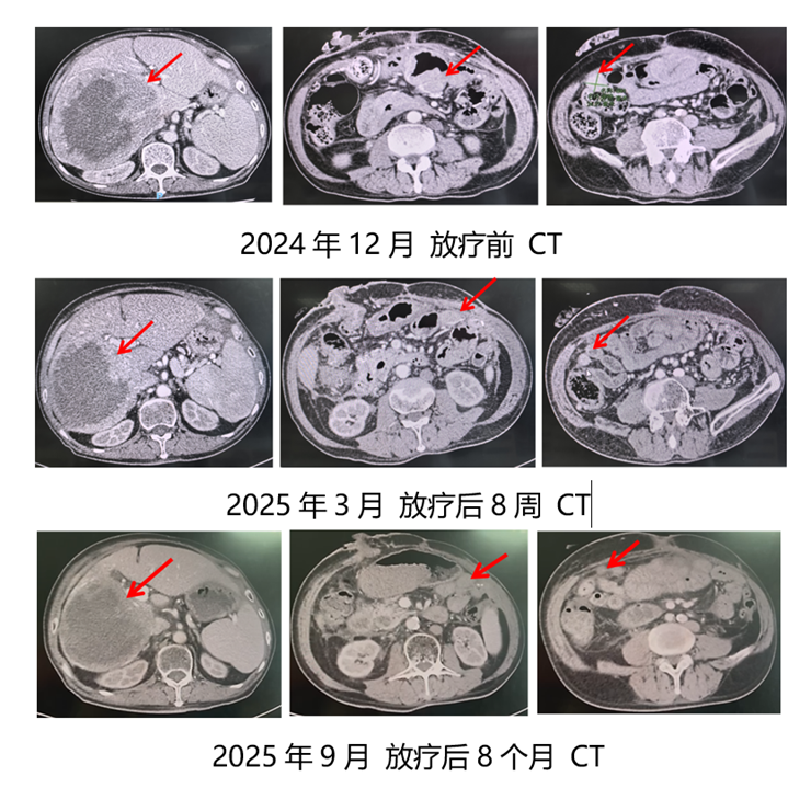 患者对放疗耐受性良好,无特殊不良反应。放疗结束后继续口服瑞派替尼150mg/d。放疗后8周2025年3月31日CT评估:肝右叶肿块大小约14cm×11.2cm,囊性部分未见强化。右侧大网膜区囊状低密度影,大小约1.8cm×1cm,未见强化;左侧大网膜区软组织肿块影,大小约3.1cm×1.8cm,增强后似轻度强化。与放疗前相比,肝转移灶及左右大网膜区病灶明显缩小,其内强化成分减少,疗效评价为SD