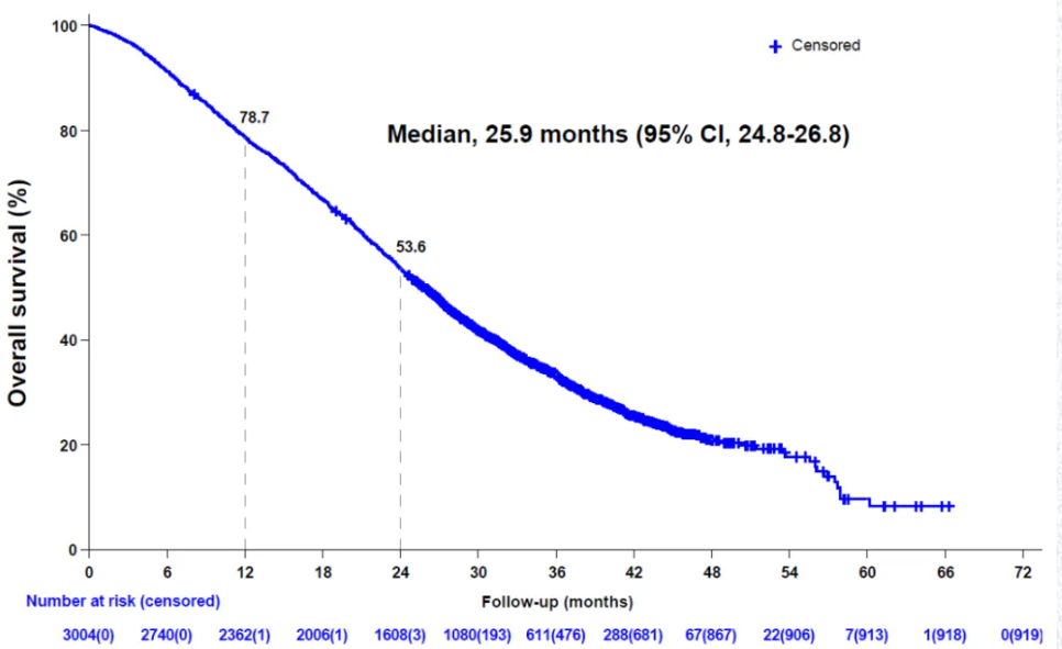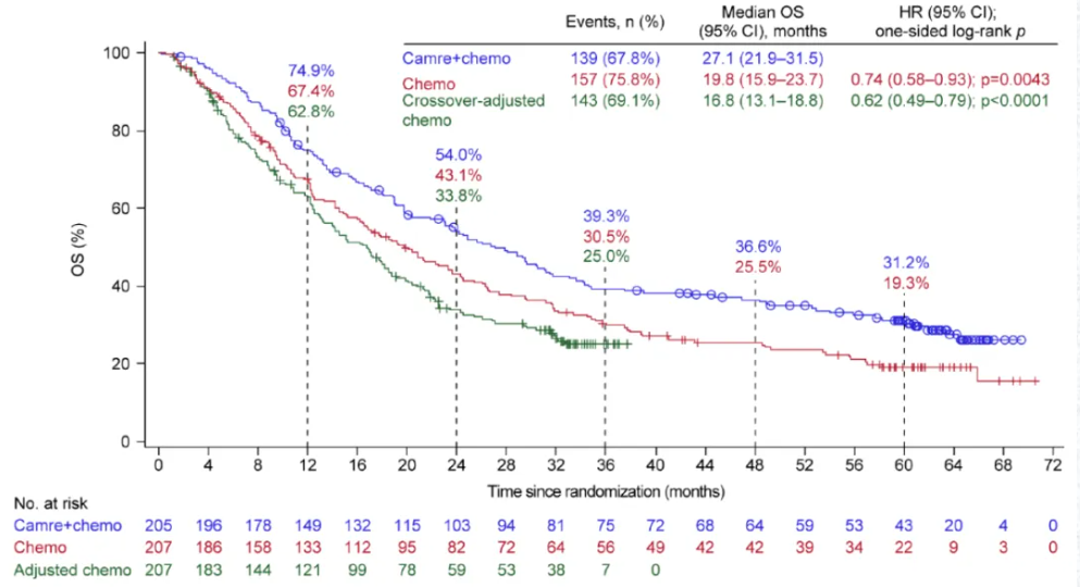 截至2025年3月5日,全队列3004例患者的中位OS为25.9个月(95% CI:24.8-26.8),中位随访25.6个月;CameL研究更新5年结果后的中位OS为27.1个月(95% CI:21.9-31.5)。在1002例有安全性数据的患者中,任何级别治疗相关不良事件(TEAEs)发生率为78.8%,≥3级TEAEs发生率为15.7%。