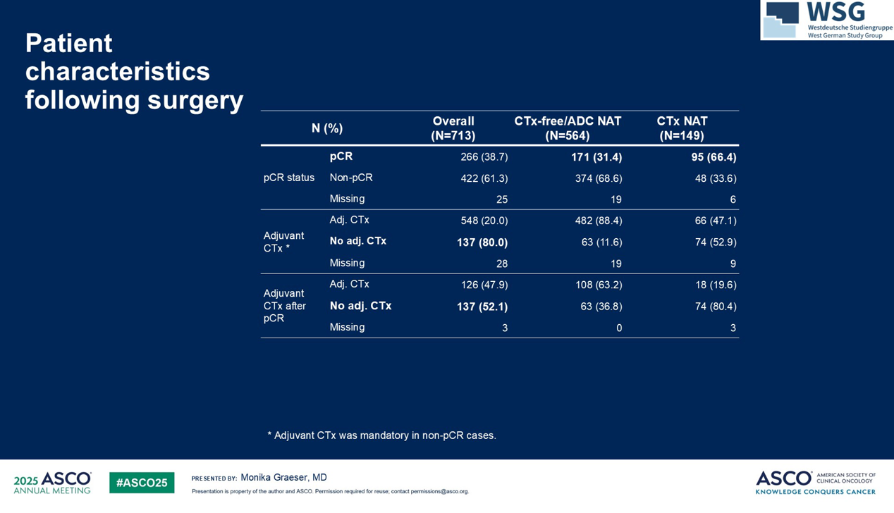研究者获得了 713 名患者的生存数据,其中 564 名在新辅助阶段接受了无化疗或 ADC 治疗,而 149 名接受了短程 12 周的基于紫杉醇类的化疗。约 1/3 的患者在新辅助无化疗或含 ADC 治疗后达到 pCR,而在含化疗的队列中,pCR 率约为 2/3。值得注意的是,有 137 名达到 pCR 的患者选择了不接受辅助化疗,其中 63 名患者在新辅助和辅助阶段均完全未接受化疗。