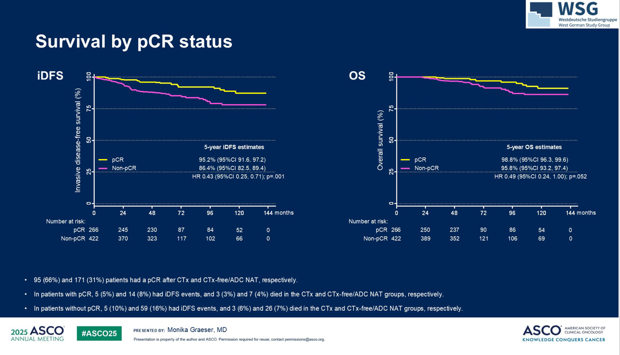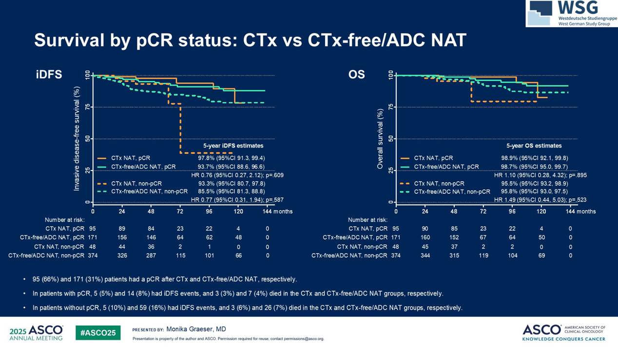 经过超过 5 年的随访,研究者观察到了非常出色的生存结果。在含化疗队列与无化疗或含 ADC 的新辅助队列之间,浸润性疾病无生存期 (iDFS)、无远处转移生存期 (DDFS) 和总生存期 (OS) 均无显著差异,例如两队列的 5 年总生存率分别为 97.8% 对比 96.8%。