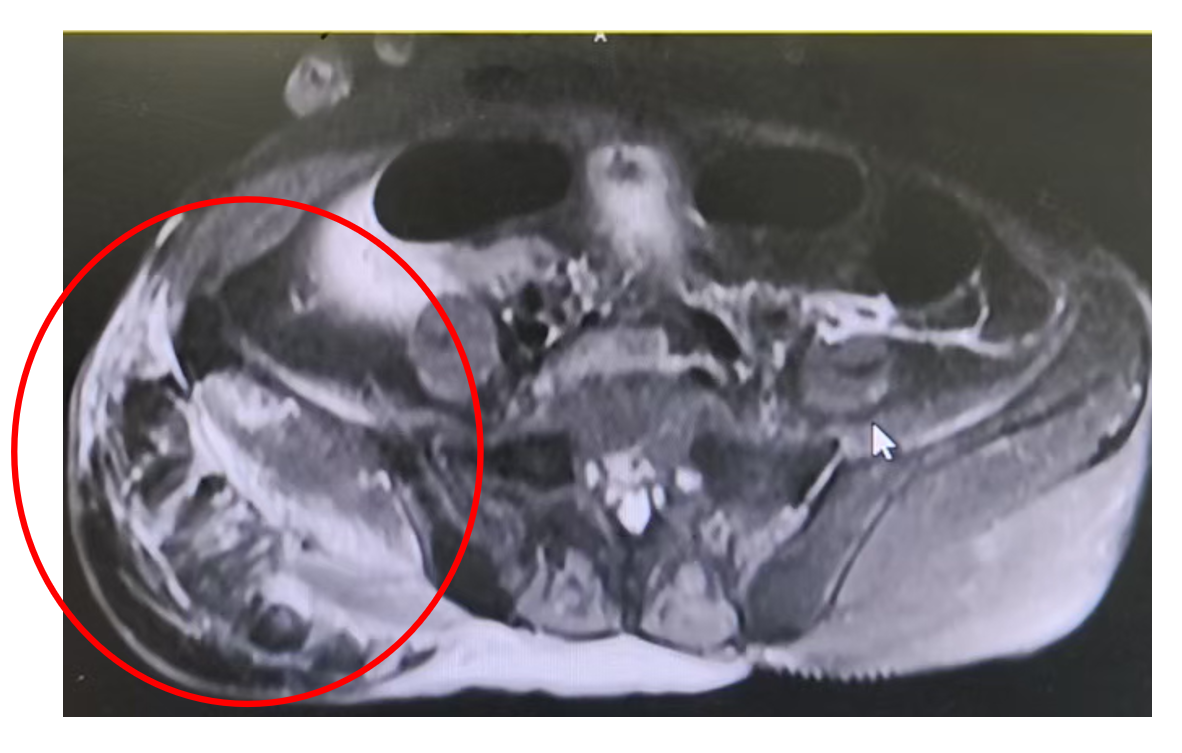 专科检查:患者呈贫血貌,言语稍含糊,左上肢、躯干、臀部、右下肢可见散在大片瘀斑、血肿,局部皮温升高,压痛阳性。辅助检查:急诊超声提示左侧上臂深筋膜层异常混合性团块(考虑血肿)范围过大,无法测量,最深约46 mm。