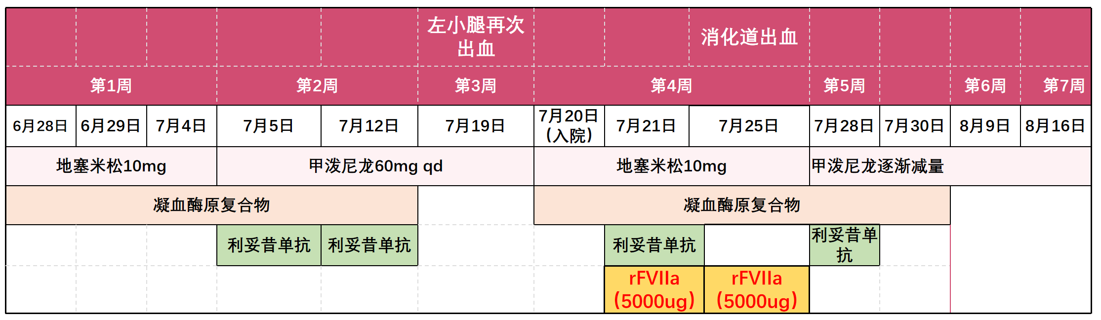 患者入院后病因学评估未见肿瘤相关依据。既往发病前合并严重且复杂的肺部感染,因此不能排除与感染或药物相关的可能。抗心磷脂抗体及抗β2糖蛋白抗体阳性,但无血栓证据,建议间隔12周以上复查。止血方面,6月28日起予凝血酶原复合物1200-1500 U q12h,并联合免疫抑制治疗以清除FⅧ抑制物。
