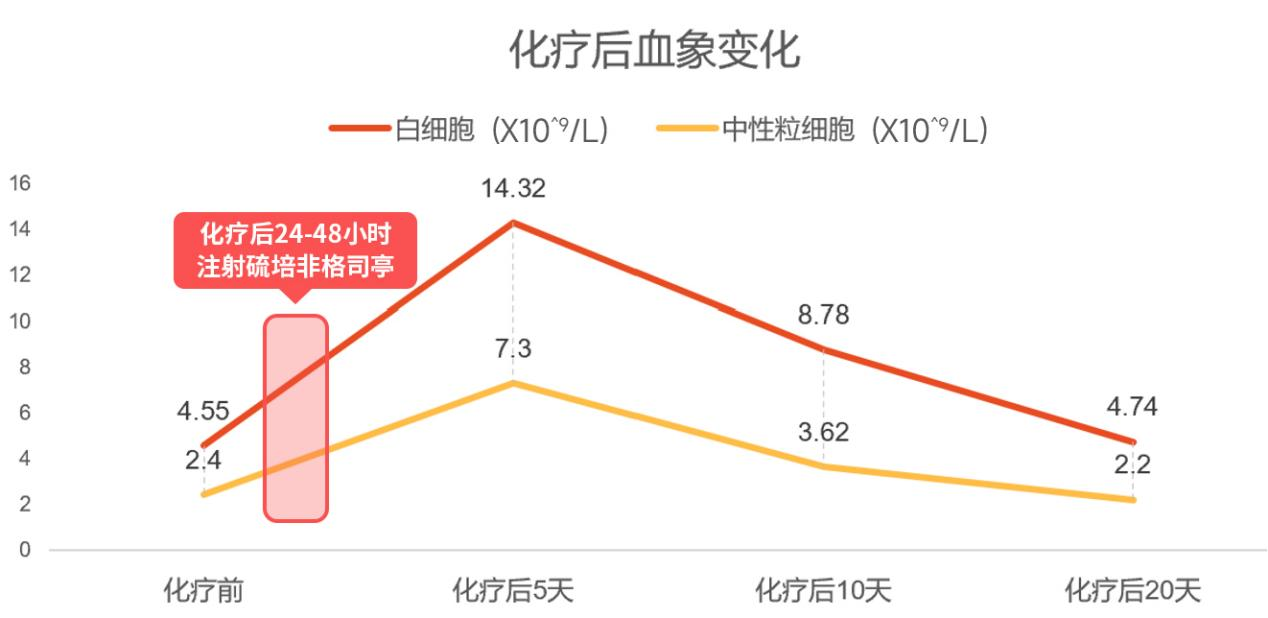 FN是化疗后严重并发症,需结合高风险方案、患者因素及预防策略综合管理。患者63岁,ECOG PS评分:1分,治疗方案为同步放化疗,为FN高危人群,诱导化疗1周期治疗后,患者出现3度骨髓抑制,遂在第2周期化疗结束后给予患者硫培非格司亭治疗。化疗结束后24-48小时内单次皮下注射。成人(≥45kg)固定剂量6mg/次。