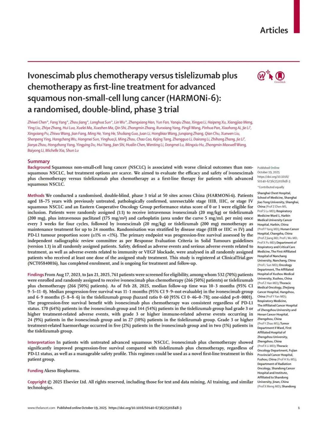 日前,由肿瘤科学术带头人、上海市肺部肿瘤临床医学中心主任陆舜教授领衔开展的HARMONi-6研究取得重要突破。10月19日,相关成果在国际学术顶刊《柳叶刀》( The Lancet )发表,同日,该研究还作为最新突破性摘要(LBA),在2025年欧洲肿瘤内科学会(ESMO 2025)大会上由陆舜教授作重磅发布。该研究探索了全球首创“肿瘤免疫+抗血管生成”双特异性抗体——依沃西单抗联合化疗一线治疗晚期鳞状非小细胞肺癌的疗效和安全性,开启了晚期肺鳞癌治疗的新格局。陆舜教授是本文的通讯作者,肿瘤科副主任陈智伟教授是本文的第一作者