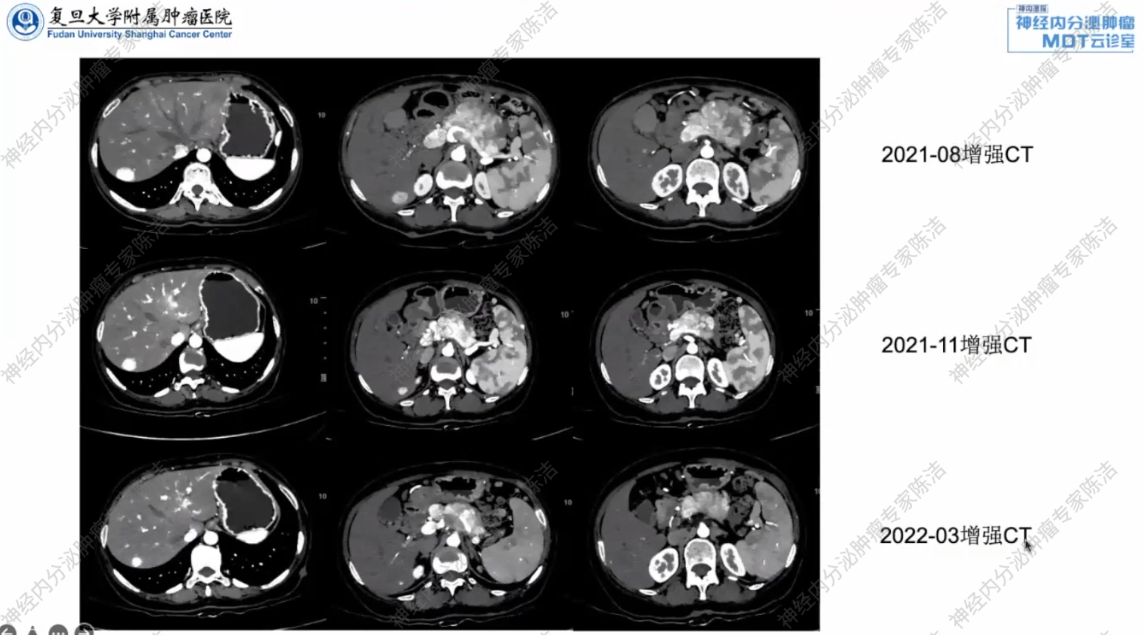 2021年8月,患者转至复旦大学附属肿瘤医院继续治疗。复查增强CT显示,胰体尾肿块,考虑MT,脾血管受累,门脉癌栓形成,SMV可疑受侵,肝多发转移,门脉海绵样变性。与外院2021年6月CT相比,疗效评估为部分缓解(PR)。