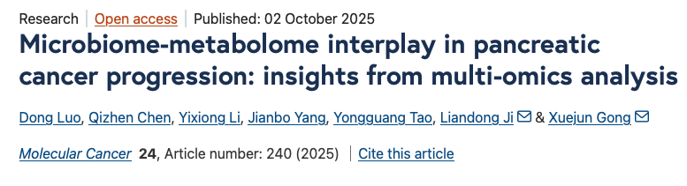 近日, 中南大学湘雅医院龚学军 、 李宜雄教授科研团队在肿瘤学国际期刊Molecular Cancer在线发表了题为Microbiome-metabolome interplay in pancreatic cancer progression: insights from multi-omics analysis 的 研究成果 , 在多组学分析揭示胰腺癌进展中微生物组 - 代谢组相互作用机制研究方面取得 进展 。