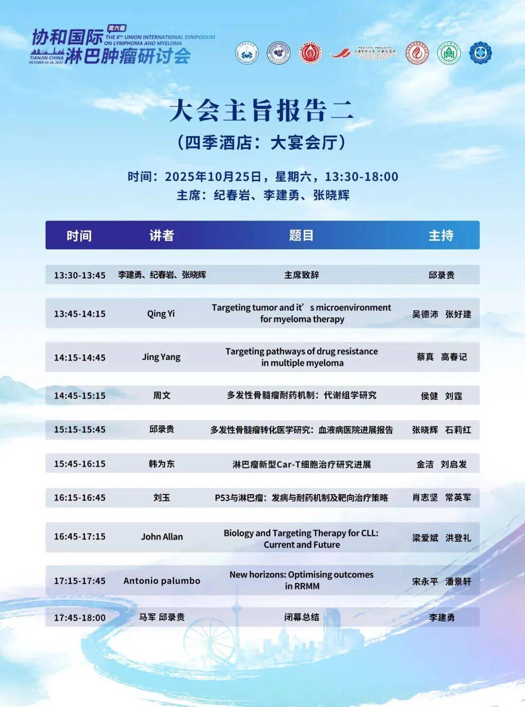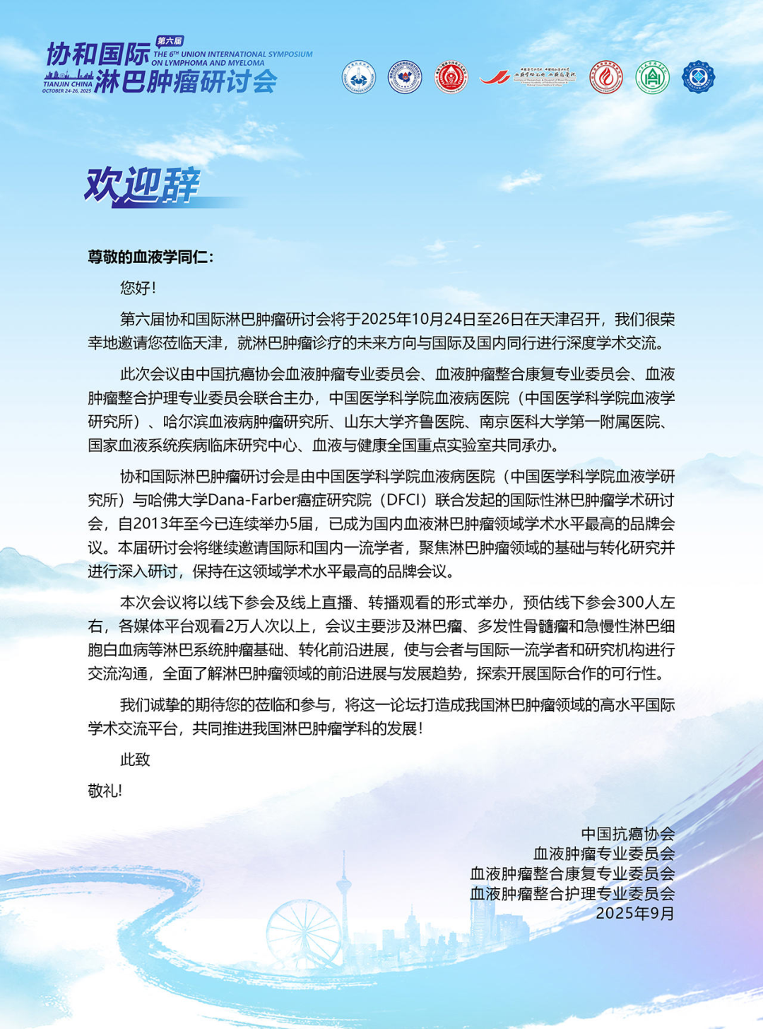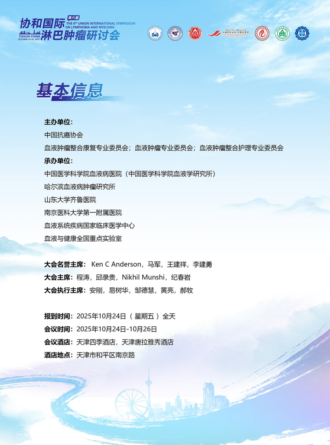 2025年10月24日至26日 由中国抗癌协会血液肿瘤专业委员会、血液肿瘤整合康复专业委员会、血液肿瘤整合护理专业委员会联合主办,中国医学科学院血液病医院 (中国医学科学院血液学研究所)、哈尔滨血液病肿瘤研究所、山东大学齐鲁医院、南京医科大学第一附属医院、国家血液系统疾病临床研究中心、血液与健康全国重点实验室共同承办 第六届协和国际淋巴肿瘤研讨会 将在天津召开。