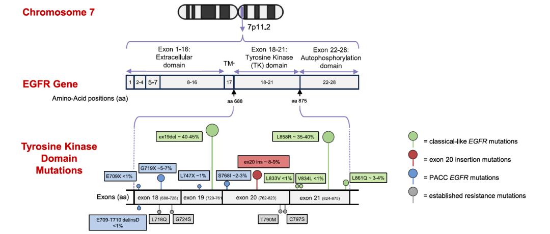 EGFR 基因定位于 7 号染色体 (7p11.2) 。图中显示 18-21 号外显子酪氨酸激酶结构域的高频突变类型:经典型突变:包括外显子 19 缺失、 L858R 突变 ( 二者统称常见 EGFR 突变 ) 及其他罕见点突变; PACC 型突变:涵盖多数非 ex20ins 突变及 T790M 突变;外显子 20 插入突变 (ex20ins) 占 EGFR 突变的 8%-9% ;同时标注了 EGFR-TKI 治疗后常见的获得性耐药突变 T790M :针对第一 / 二代 TKIs 的耐药突变; C797S 、 G724S 、 L718Q :针对第三代 TKIs 的耐药突变 ( 注: ex20ins 指外显子 20 插入突变; PACC 表示 P 环与α C 螺旋压缩型突变; TM 为 EGFR 跨膜结构域)。