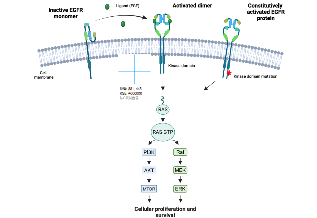 EGFR 蛋白以非活性单体形式嵌于细胞膜中。当配体 ( 如 EGF) 结合后,受体发生二聚化并转变为激活状态。这种激活可触发 MAPK 、 PI3K-AKT-mTOR 等细胞内信号级联反应,从而调控细胞增殖、存活及分化过程。 EGFR-TKD 的突变可导致该蛋白及其下游信号通路的持续性、非配体依赖性激活。