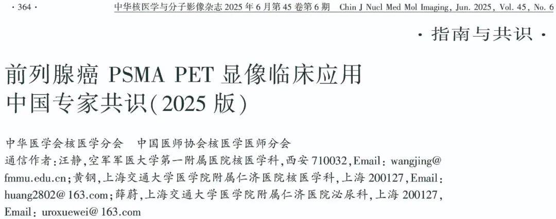 引用本文: 中华医学会核医学分会,中国医师协会核医学医师分会.前列腺癌 PSMA PET显像临床应用中国专家共识(2025版)[J] . 中华核医学与分子影像杂志, 2025, 45(6) : 364-371. DOI:10.3760/cma.j.cn321828-20250223-00050. .