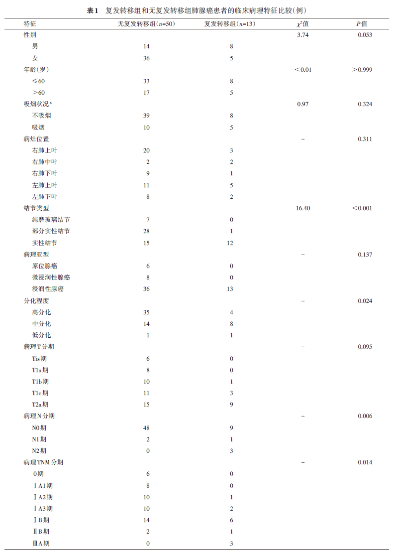 3. 复发转移组和无复发转移组患者的临床病理特征比较: 复发转移组和无复发转移组患者的结节类型( P <0.001)、分化程度( P =0.024)、病理N分期( P =0.006)、病理TNM分期( P =0.014)、治疗方式( P =0.017)差异有统计学意义(表1)。