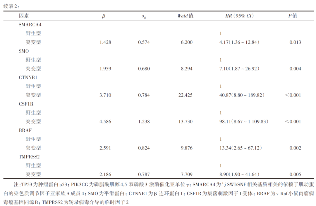 6. 临床ⅠA 期肺腺癌患者预后影响因素分析: 单因素Cox回归分析结果显示,性别、结节类型、分化程度、病理分期、治疗方式、TP53突变、PIK3CG突变、SMARCA4突变、SMO突变、CTNNB1突变、CSF1R突变、BRAF突变、TMPRSS2突变为临床ⅠA期肺腺癌患者预后的影响因素(均 P <0.05,表2)。将单因素分析结果中 P <0.05的因素纳入Cox模型进行多因素回归分析,结果显示,PIK3CG突变( HR =21.52,95% CI :3.19~145.01, P =0.002)、SMO突变( HR =35.28,95% CI :3.12~398.39, P =0.004)、CTNNB1突变( HR =332.86,95% CI :15.76~7 029.05,P <0.001)、CSF1R突变( HR =8 109.60,95% CI :114.19~575 955.17, P <0.001)、BRAF突变( HR =23.65,95% CI :1.86~300.43, P =0.015)为临床ⅠA期肺腺癌患者预后的独立危险因素。