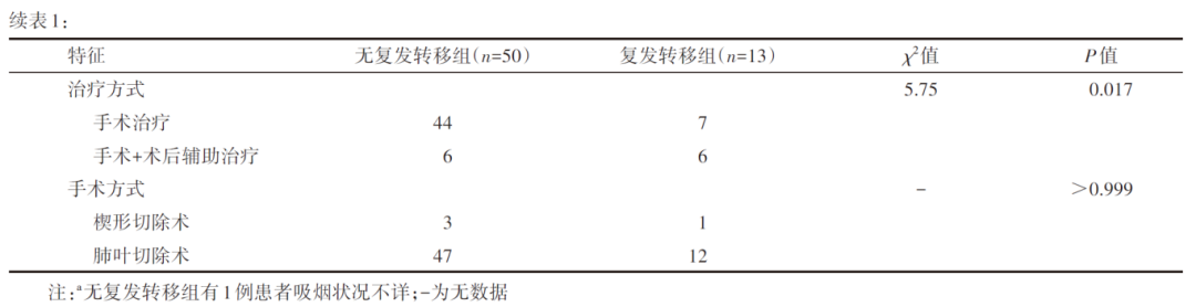 2. 复发、转移情况: 到随访截止时,63例患者中,13例出现了复发或转移,50例无转移生存。无转移生存患者的随访时间为137(148,131)个月,范围120~200个月;发生复发或转移患者,自手术至复发转移的时间为35(29,85)个月,范围1~127个月。13例发生复发或转移的患者中,单纯肺转移3例,淋巴结转移2例,胸膜转移2例,骨转移2例,局部复发1例,多部位转移3例(转移的部位包括肺、胸膜、骨、脑)。有4例患者手术5年以后才出现转移,具体分别为术后127、94、90和80个月。
