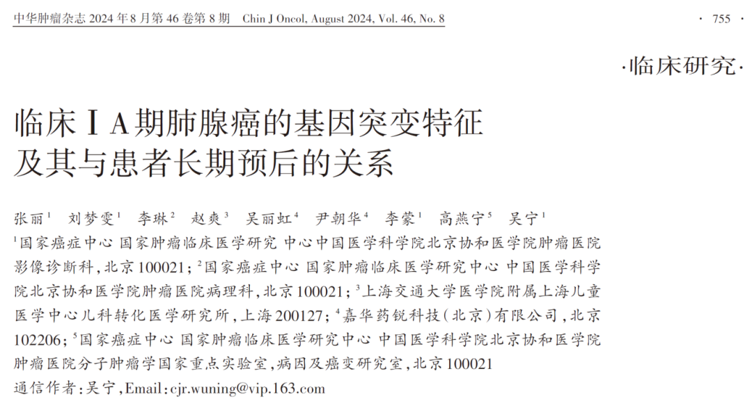 张丽, 刘梦雯, 李琳, 等. 临床ⅠA期肺腺癌的基因突变特征及其与患者长期预后的关系[J]. 中华肿瘤杂志, 2024, 46(8):755-763. DOI: 10.3760/cma.j.cn112152-20231128-00338 .
