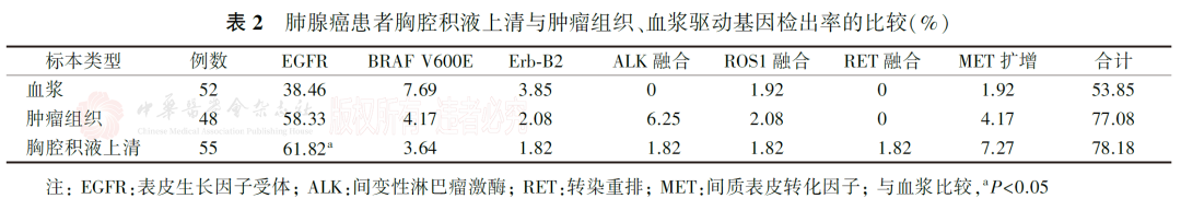 胸腔积液上清EGFR基因突变的检出率为61.82%,高于血浆( P <0.05),与肿瘤组织差异无统计学意义( P >0.05)。而胸腔积液上清中其他驱动基因BRAF V600E、Erb-B2、间变性淋巴瘤激酶(anaplastic lymphoma kinase, ALK)融合、ROS1融合、转染重排(rearranged during transfection, RET)融合、间质表皮转化因子(mesenchymal-to-epithelial transition, MET)扩增(含14号外显子跳跃)的检出率,与血浆和肿瘤组织差异均无统计学意义(均 P >0.05,表2)。