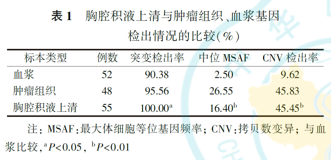 总之,基于NGS技术,肺腺癌患者胸腔积液上清与肿瘤组织作为基因突变检测样品的临床意义相当,能提供比血浆样品更全面的突变信息和更高的MSAF,具有较高的可靠性和有效性,可以作为NSCLC基因检测的理想替代样本。