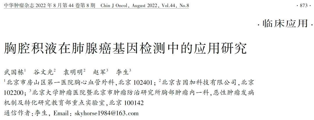 武国栋, 谷文光, 袁明明, 等. 胸腔积液在肺腺癌基因检测中的应用研究[J]. 中华肿瘤杂志, 2022, 44(8):873-876.