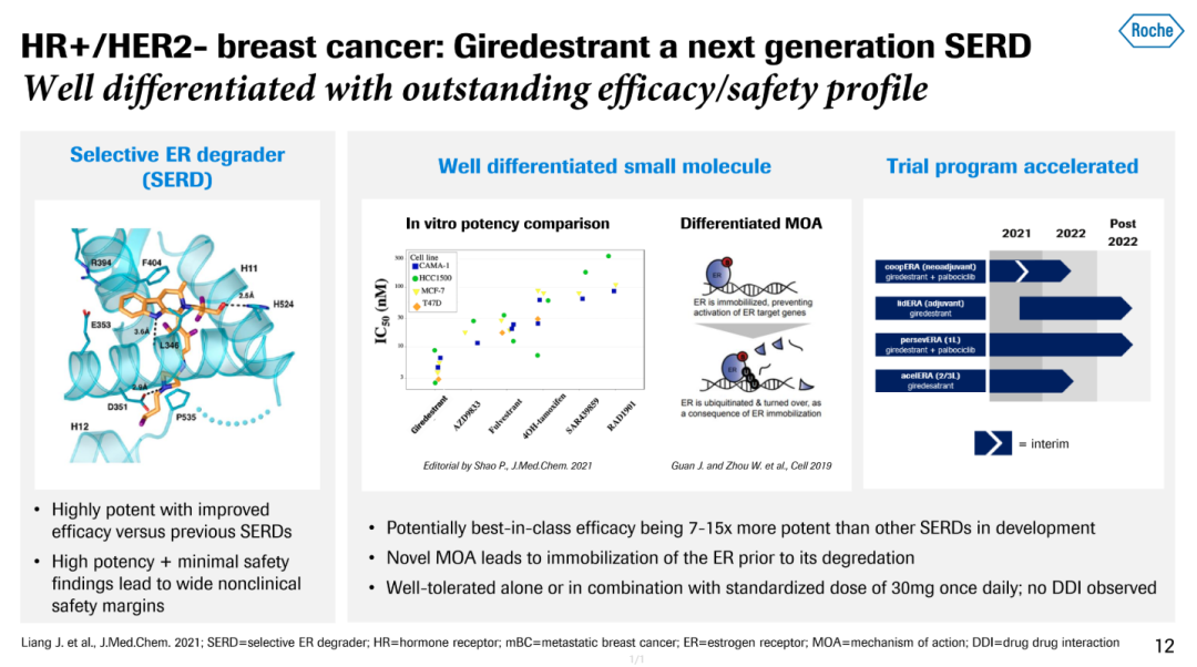 Giredestrant是一种在研的口服强效新一代选择性雌激素受体降解剂(SERD)和完全拮抗剂。其作用机制为阻断雌激素与雌激素受体结合,诱导受体降解,从而抑制或延缓癌细胞生长。