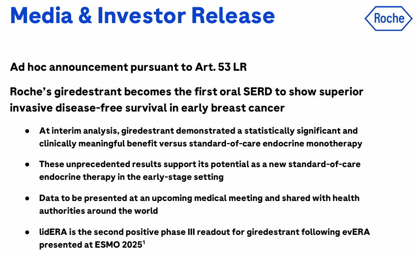 罗氏新一代口服SERD药物III期研究成功