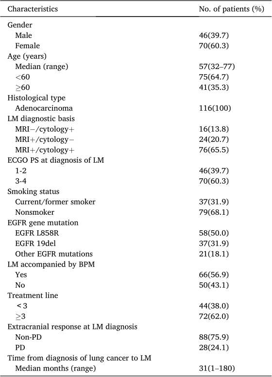116例患者中位年龄57岁(范围32-77岁),64.7%(75例)年龄<60岁,35.3%(41例)≥60岁;女性占60.3%(70例),男性占39.7%(46例);所有患者均为腺癌;脑膜转移诊断依据中,13.8%(16例)为MRI阴性/细胞学阳性,20.7%(24例)为MRI阳性/细胞学阴性,65.5%(76例)为MRI阳性/细胞学阳性;基线ECOG体能状态1-2级占39.7%(46例),3-4级占60.3%(70例);从不吸烟者占68.1%(79例),当前/既往吸烟者占31.9%(37例);EGFR基因突变类型中,21外显子L858R突变占50.0%(58例),19外显子缺失占31.9%(37例),其他EGFR突变占18.1%(21例);56.9%(66例)患者合并脑实质转移,43.1%(50例)无合并;38.0%(44例)患者治疗线数<3线,62.0%(72例)≥3线;脑膜转移诊断时,75.9%(88例)患者颅外无进展,24.1%(28例)存在颅外进展;从肺癌诊断至脑膜转移的中位时间为31个月(范围1-180个月)(表1)。