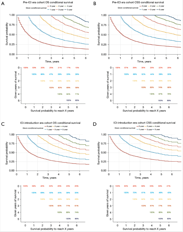 经倾向评分匹配(PSM)平衡基线特征后,ICI应用后队列的OS和CSS较ICI应用前队列实现显著提升,调整后全因死亡风险降低20%(HR=0.80),癌症特异性死亡风险降低24%(HR=0.76);条件生存分析进一步显示,两队列患者的5年条件OS/CSS率均随生存时间延长逐步升高,且ICI引入队列在各时间点的生存率均显著更高,例如生存4年后,ICI应用后队列的5年条件OS率达86%,高于ICI应用前队列的84%。