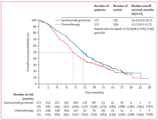 研究结果显示,与TPC相比,戈沙妥珠单抗显著延长了患者的中位PFS(5.5个月 vs 4.0个月,HR=0.66,P=0.0003)和中位OS(14.4个月 vs 11.2个月,HR=0.79,P=0.020),降低21%的死亡风险。且戈沙妥珠单抗组的18个月PFS率为14.4%,是化疗组(4.7%)的3倍1。亚组分析进一步证实,无论患者HER2表达水平如何(HER2低表达或HER2零表达),戈沙妥珠单抗均能带来一致的生存获益2