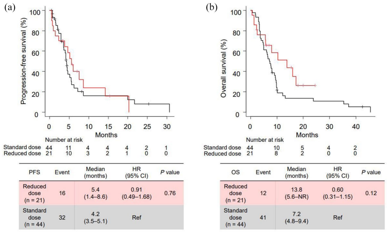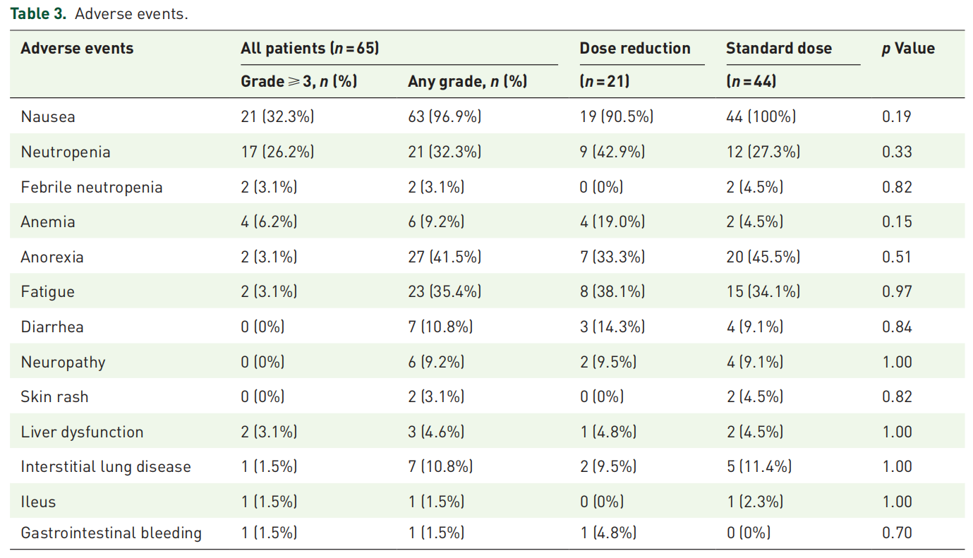 98.5%患者出现任意级别AE,≥3级AE发生率为36.9%。最常见血液学毒性为中性粒细胞减少(32.3%)和贫血(9.2%),≥3级中性粒细胞减少占26.2%。非血液学毒性以恶心(96.9%)、食欲减退(41.5%)和乏力(35.4%)为主,≥3级恶心占32.3%。间质性肺病发生率为10.8%(8例),多数为1-2级。15.3%患者因AE停药。初始减量组与标准剂量组的疗效无显著差异(mOS 13.8 vs 7.2个月,HR=0.60,P=0.12),但减量组因AE停药率显著更低(4.8% vs 18.6%)。多因素分析显示初始减量是OS的独立预测因素(HR=0.31,P=0.02)。