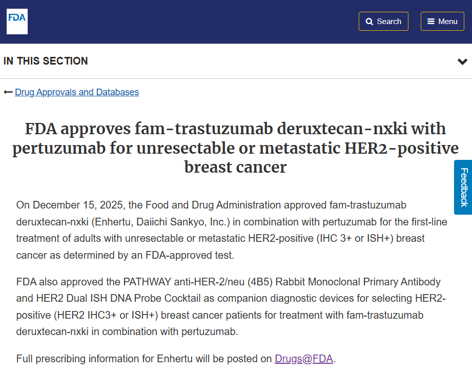 2025年12月15日,美国食品药品监督管理局批准德曲妥珠单抗(fam-trastuzumab deruxtecan-nxki)与帕妥珠单抗(pertuzumab)联合用于一线治疗经FDA批准的检测确定的不可切除或转移性HER2阳性(IHC 3+ 或 ISH+)乳腺癌成人患者。