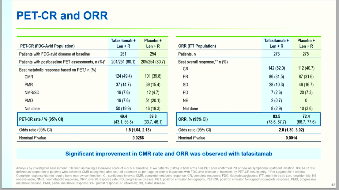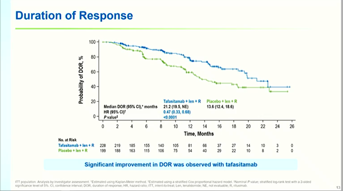 缓解率深度与持久性显著提升:坦昔妥单抗组ORR达83.5%(对照组72.4%,OR 2.0, P=0.0014),完全缓解(CR)率提升至52.0%(对照组40.7%)。PET-CR率分别为39.8%与31.5%(OR 1.5, P=0.0286),显示代谢缓解深度改善。中位DoR延长至21.2个月(对照组13.6个月,HR 0.48, P<0.0001),缓解持续时间延长56%。