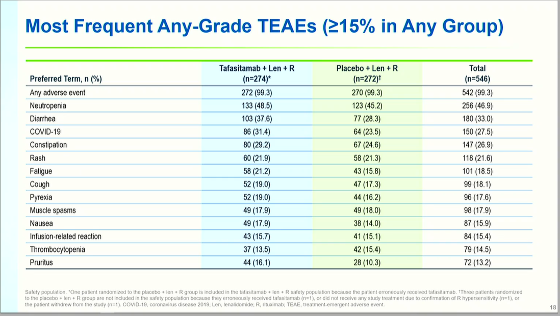 剂量调整与停药率:因TEAE导致研究治疗中断的比例在坦昔妥单抗组略高(11% vs 7%),但来那度胺剂量中断(74% vs 70%)及减量(14% vs 11%)比例两组相当,提示坦昔妥单抗未显著增加整体治疗毒性。研究期间共46例死亡,疾病进展相关死亡在坦昔妥单抗组更低(2% vs 6%),感染相关死亡各组6例(2%)。