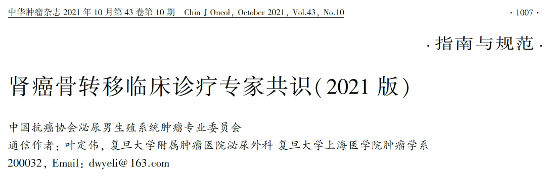 中国抗癌协会泌尿男生殖系统肿瘤专业委员会. 肾癌骨转移临床诊疗专家共识(2021版)[J]. 中华肿瘤杂志, 2021, 43(10):1007-1015. DOI:10.3760/cma.j.cn112152-20210709-00505