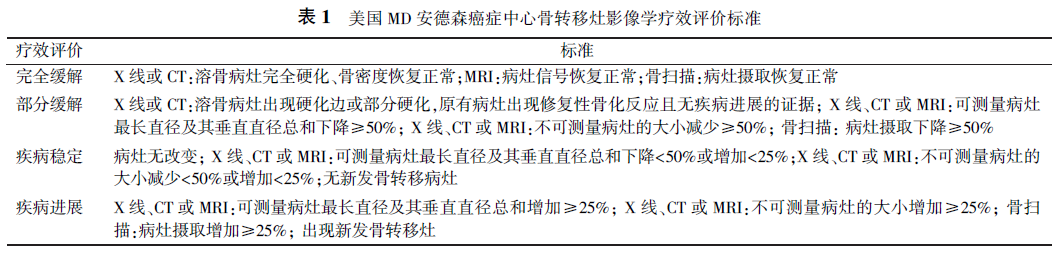 (3)影像学评估: 恶性肿瘤骨转移的影像学评价包括肿瘤消退和溶骨性病灶再矿化的评价,可考虑使用美国MD安德森癌症中心(MD Anderson Cancer Center, MDA)标准评价骨转移灶疗效(表1)。