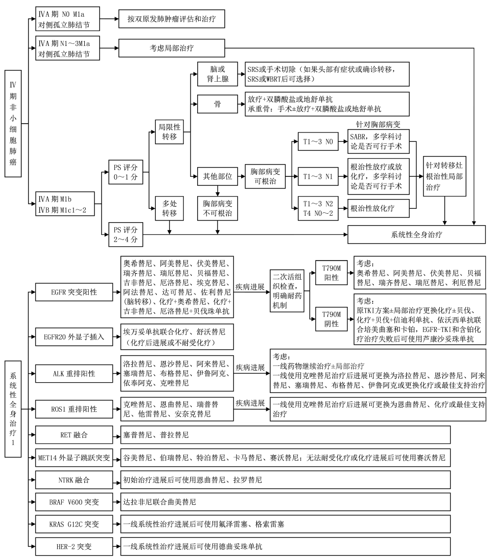 (1 )EGFR 驱动基因阳性的Ⅳ 期非鳞状细胞癌患者: 如果一线未使用EGFR-TKI,二线治疗时建议首先使用EGFR-TKI( 1类推荐证据 )。EGFR20外显子插入突变的患者含铂化疗后进展,或不耐受含铂化疗可使用舒沃替尼( 1类推荐证据 )。一线使用EGFR-TKI后疾病进展患者,根据进展类型分为寡进展型、广泛进展型。①若为寡进展型,可继续原EGFR-TKI治疗±局部治疗( 2A类推荐证据 )。治疗后再次进展,若一线使用一代/二代EGFR-TKI推荐二次活检以检测T790M突变状态。若一线使用三代EGFR-TKI治疗后再次进展,推荐含铂双药化疗联合或不联合贝伐珠单抗或联合信迪利单抗及贝伐珠单抗( 2A类推荐证据 ),依沃西单抗联合培美曲塞和卡铂( 1类推荐证据 ) 。②若为广泛进展型,一代/二代TKI耐药后推荐二次活检以检测T790M突变状态,T790M阳性者,推荐奥希替尼或阿美替尼、伏美替尼、贝福替尼治疗、瑞齐替尼、瑞厄替尼、利厄替尼( 1类推荐证据 ),T790M阴性者及一线使用三代EGFR-TKI进展后,推荐含铂双药化疗联合或不联合贝伐珠单抗或联合信迪利单抗及贝伐珠单抗( 2A类推荐证据 )、依沃西单抗联合培美曲塞和卡铂( 1类推荐证据 ) 。EGFR-TKI和含铂化疗治疗失败后可使用芦康沙妥珠单抗( 1类推荐证据 ) 。三线PS评分0~2分可接受单药化疗或在无禁忌证的情况下推荐使用安罗替尼( 2A类推荐证据 )。