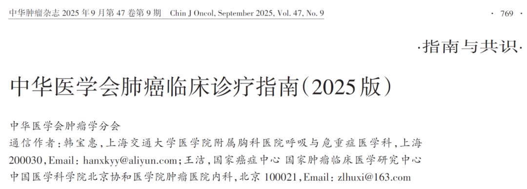 中华医学会肿瘤学分会. 中华医学会肺癌临床诊疗指南(2025版)[J]. 中华肿瘤杂志, 2025, 47(9): 769-810. DOI: 10.3760/cma.j.cn112152-20250511-00215