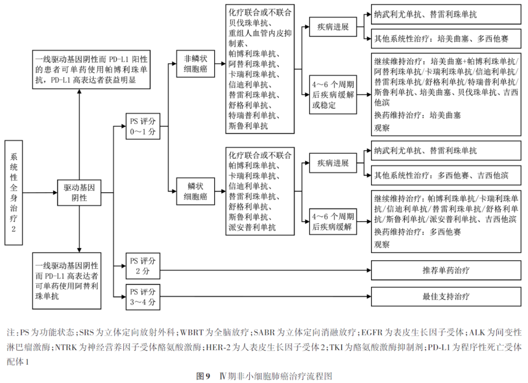PS评分0~2分驱动基因阴性非鳞状细胞癌患者一线进展后,如未接受过免疫治疗,推荐二线治疗使用纳武利尤单抗( 1类推荐证据 )、或替雷利珠单抗( 2A类推荐证据 )。PS评分0~2分驱动基因阴性非鳞状细胞癌患者一线进展后也可使用多西他赛( 1类推荐证据 )或培美曲塞( 2A类推荐证据 )单药化疗。对于PS评分>2分的患者,二线建议最佳支持治疗。若前期未使用培美曲塞或多西他赛单药治疗者,三线可接受培美曲塞或多西他赛单药治疗( 2A类推荐证据 ),或在无禁忌证的情况下推荐使用安罗替尼( 2A类推荐证据 ),后线建议最佳支持治疗。