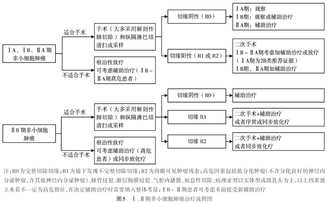 2. 非完整切除切缘阳性NSCLC 的后续治疗: (1)ⅠA(T1a/b/cN0)期患者,术中发现为R1或R2切除,可选择再次手术或局部放疗( 2B 类推荐证据 )。(2)ⅠB(T2aN0)/ⅡA(T2bN0)期患者,术中发现为R1或R2切除,可选择再次手术或局部放疗,后续化疗视情况而定。ⅠB期有高危险因素者[如低分化肿瘤(包括神经内分泌肿瘤但不包括分化良好的神经内分泌肿瘤)、脉管侵犯、楔形切除、脏层胸膜侵犯、未知的淋巴结状态Rx]可考虑进行术后辅助化疗,病理亚型以实体型或微乳头为主的ⅠB期腺癌患者也可考虑辅助化疗( 2B 类推荐证据 )。ⅡA期患者均应进行辅助化疗( 2A 类推荐证据 )。(3)ⅡB期R1切除患者可选择再次手术和术后辅助化疗,或同步或序贯放化疗;R2切除患者可选择再次手术和术后辅助化疗,或者同步放化疗( 2A 类推荐证据 )。
