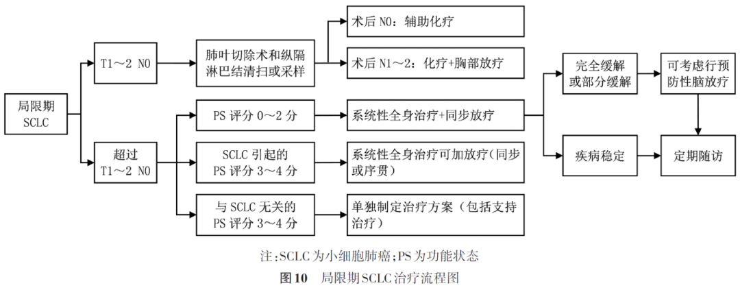 (1 )可手术局限期SCLC 患者(T1 ~2N0 )的治疗: 经系统的分期检查(包括胸部增强CT、腹部、盆腔增强CT、头部增强MRI或增强CT及全身骨显像;因为PET-CT对分期诊断有较好的效能,有条件的患者可选择PET-CT, 2A类推荐证据 )后提示无淋巴结转移的T1~2N0的患者,推荐根治性手术,术式为肺叶切除术+肺门、纵隔淋巴结清扫术( 2A类推荐证据 );术后病理提示N0的患者推荐辅助化疗,方案包括依托泊苷+顺铂、依托泊苷+卡铂( 2A类推荐证据 );术后病理提示N1和N2的患者,推荐行辅助化疗合并胸部放疗( 2A类推荐证据 ),同步或序贯均可。辅助化疗方案推荐依托泊苷+顺铂( 1类推荐证据 )。可以根据患者的实际情况决定是否行预防性脑放疗(prophylactic cranial irradiation, PCI; 3类推荐证据 )。