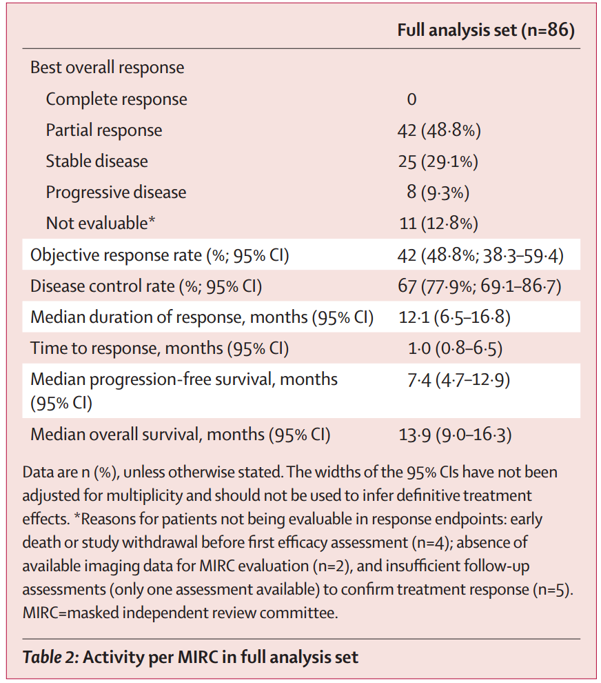 研究显示,在全分析集(FAS)的86名患者中,独立评审委员会(MIRC)评估的总体客观缓解率(ORR)达到了48.8%(95% CI 38.3–59.4),疾病控制率(DCR)高达77.9%。这一数据在数值上显著优于既往同类药物在类似人群中的表现。