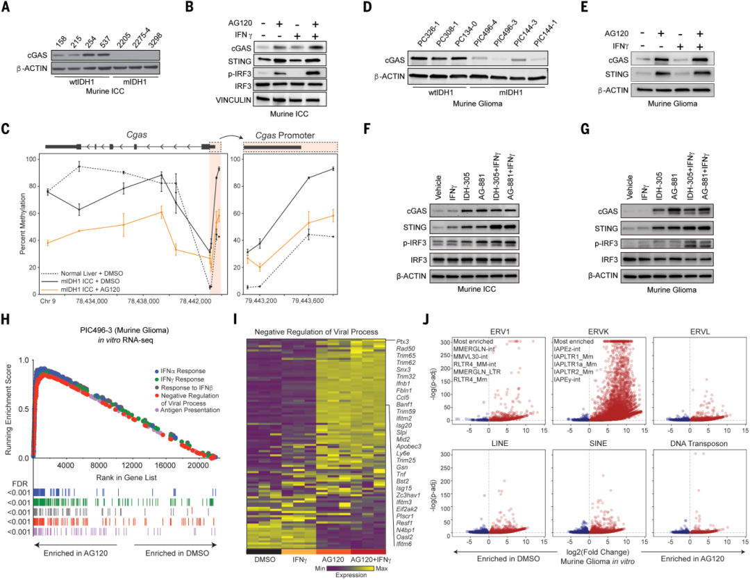 研究结果揭示,mIDH1抑制剂通过激活TET2介导的DNA去甲基化,逆转了肿瘤细胞中细胞质双链DNA传感器(cGAS)基因位点的高甲基化沉默状态,同时激活了特定内源性逆转录病毒(ERV)。这些ERV编码的逆转录酶(RT)产生胞质双链DNA,进而激活cGAS-STING-IRF3信号通路,触发“病毒模拟”反应,诱导I型干扰素及其下游抗病毒和免疫刺激性基因表达程序。该过程与干扰素γ反应恢复产生协同作用,形成正向反馈环路,最终驱动CD8⁺ T细胞浸润肿瘤并抑制肿瘤细胞增殖。机制上,cGAS或ERV-RT的基因敲除完全阻断了IDH1抑制剂诱导的免疫激活和抗肿瘤效果,而dsRNA感知通路组件MAVS的敲除则无影响。在人类IDH1突变型胆管癌和胶质瘤细胞及患者样本中,同样观察到cGAS位点的特异性高甲基化与表达沉默,且IDH1抑制剂治疗能恢复其表达并诱导类似的病毒模拟反应。